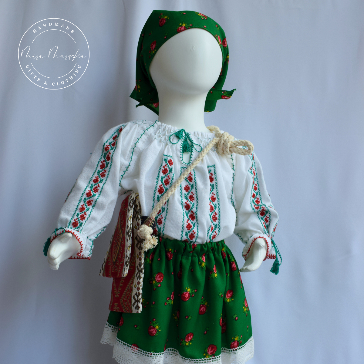 Costumul tradițional pentru fetițe de la Mira Maruska, destinat vârstei de 0-1 an, este o ținută autentică, lucrată cu atenție la detalii și confort. Ia este cusută manual pe pânză de bumbac, evidențiind motive tradiționale românești și oferind delicatețe și confort pielii sensibile a bebelușului. Fustița din vâscoză, decorată cu o bordură fină de dantelă din bumbac, adaugă un farmec aparte, completând perfect aspectul tradițional. Baticul din vâscoză și trăistuța inclusă întregesc acest costum fermecător.